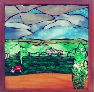 This was created with stained glass on glass, along with a few of the original shells we collected from that beach.